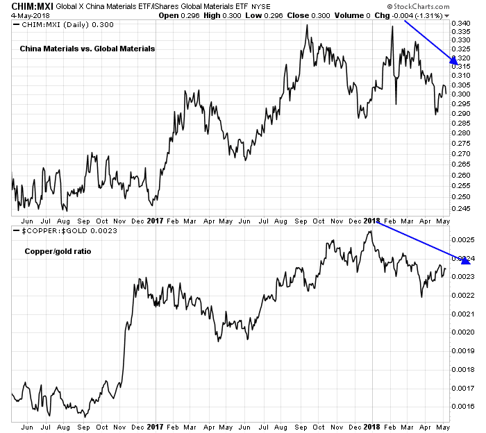 Copper has its own idiosyncrasies too. Long before China became the dominant global growth engine, copper was regarded as a good indicator of global cyclicality. Now that China has become the largest consumer of commodities, copper prices are reflective of Chinese economic activity. The chart below shows the ratio of China Materials ETF (CHIM) to Global Materials (MXI) in the top panel, and the copper/gold ratio in the bottom panel. The coincident weaknesses of the CHIM/MXI and copper/gold ratios are probably reflective of softness in China.