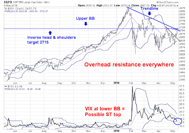 To be sure, I don’t pretend that this is an unqualified buy signal. There is plenty of overhead resistance that could stall this rally, starting with an initial resistance zone at about 2865. There is also a second declining trend line, which will act as secondary resistance. Beyond that, the IHS measured target of about 2715 also coincides with the upper Bollinger Band. The rally could stall at any of these levels in the near future. In addition, the VIX Index has breached its lower Bollinger Band, which is often the sign of either a short-term top, or a brief consolidation period.