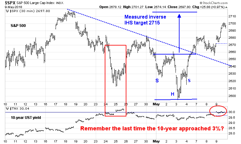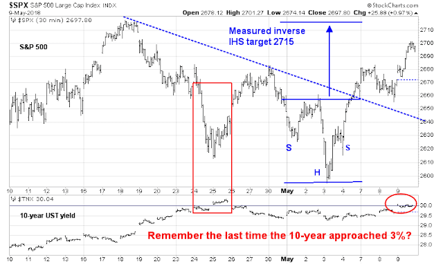 I can point to a number of constructive technical and sentiment indicators with bullish implications. From a short-term tactical perspective, the SPX has staged both an upside breakout through a downtrend, and broken out of an inverse head and shoulders (IHS) pattern. In addition, the market shrugged off a rise in the 10-year Treasury yield up to the 3% level. Remember how stock prices reacted the last time this happened?
