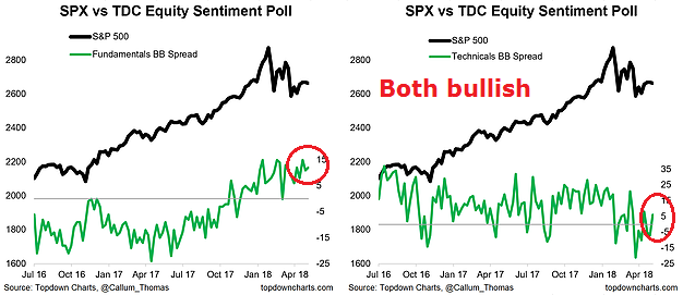 Mid-week market update: In my last mid-week market update (see Still choppy, still consolidating), I highlighted the weekly (unscientific) sentiment survey conducted by Callum Thomas. The poll showed fundamentally oriented investors to be very bullish, while technical survey was bearish. I suggested at the time that one of the signs that the sideways consolidation may end was an agreement between the fundamental and technical survey, indicating either positive or negative momentum.