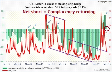 The latest CoT data shows that large speculators have moved from a net long to a net short position in VIX. Complacency is returning to the markets, but readings are not extreme and rising VIX shorts can be interpreted as a sign of positive equity price momentum.