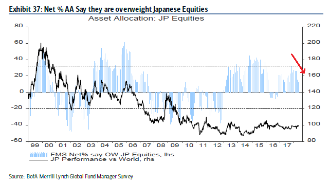 For example on the Europe chart, the level of institutions overweight stayed the same from 2013 to 2015 while the price of the Europe Index versus the World fell dramatically. Therefore portfolio managers were buying heavily as stocks fell.