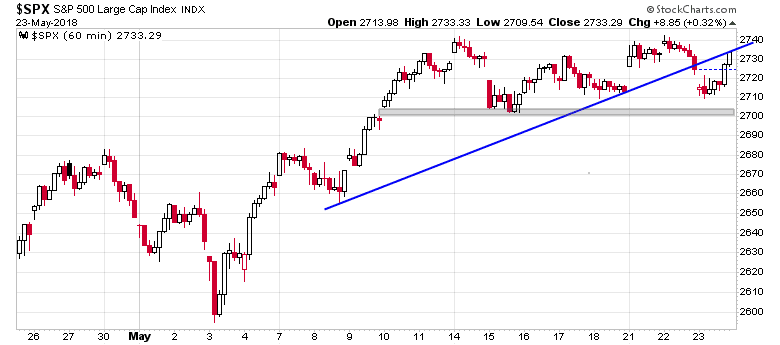 The hourly chart is also supportive of the minor pullback thesis. The index breached an uptrend line that began on May 8, 2018. Under these conditions, minor weakness is likely, and it will be up to the bears to see if they can take control of the tape.