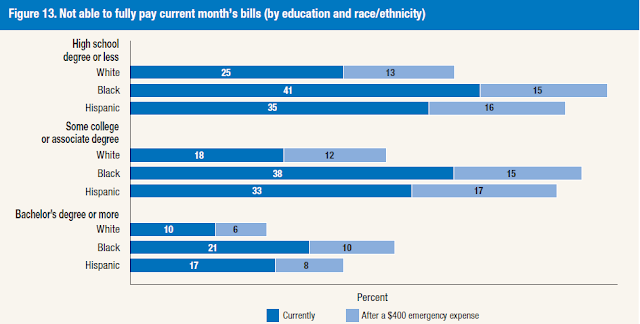 The flip side of the coin shows the respondents who were unable to fully pay the current month’s bills. We can observe a marked deterioration by education, and within each educational grouping, by race.