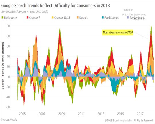 In addition, searches for bankruptcy and financial reorganization spiked recently, indicating rising stress in the household sector.
