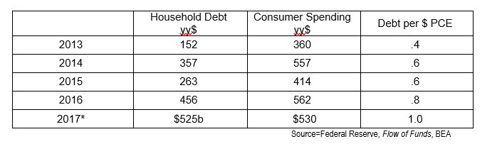 After drawing down savings, consumers could borrow to finance spending. The Fed’s flow of funds data shows that households are funding virtually all of their marginal expenditures with debt, up from 40% in 2013.