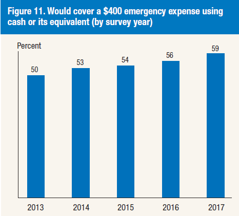 Oh, and the headline about 40% of American households who can`t cover a $400 emergency expense? While the absolute level is still worrisome, the same Fed survey shows that the trend has been steadily improving.