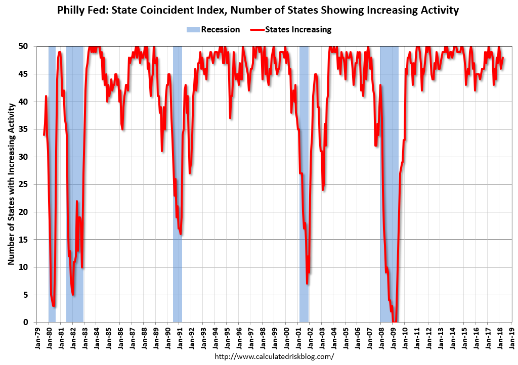 Other nowcast indicators are flashing bullish readings. The Philly Fed coincident state indices rose in 45 states, and the three month diffusion index was up in 49 states out of 50 (via Calculated Risk). Other elements of the Philly Fed indices are also upbeat (see Bear markets simply don’t start this way).