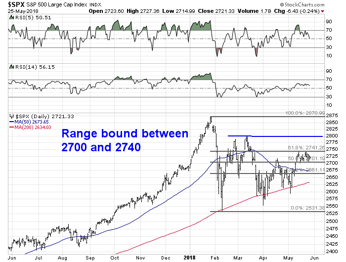Shorter term, the SPX remains in a short-term no-man’s land between Fibonacci retracement levels of 2700 and 2740, with further resistance at 2800. Until either the bulls or bears can demonstrate sufficient resolve to break either of these levels, my inner trader is leaning slightly bullish but he is playing a waiting game.