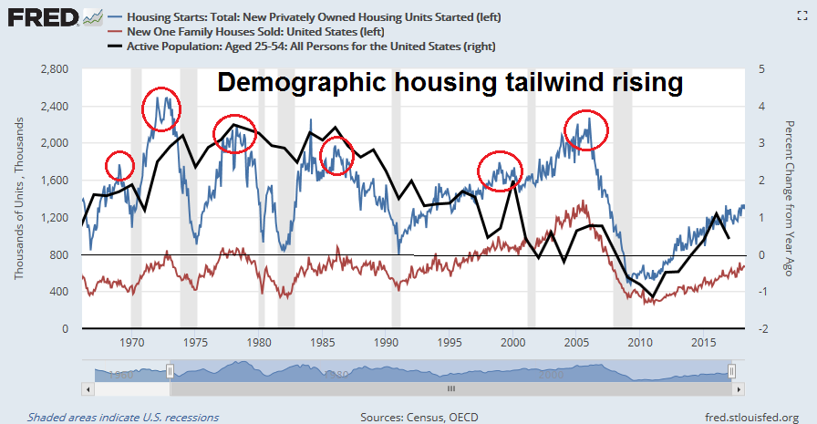 With regards to what you have written here about housing sector, roll back the clock ten years back from today, circa 2008. That was the year when the first wave of housing foreclosures/bankruptcies started to hit Americans. It takes ten years to wipe credit delinquencies, and 2018 is the tenth year. Going forward, one could speculate that there will be a slow burn, increasing demand for housing from “clean” creditors. Anecdotally, talking to realtors, significant number of housing sales in some of US cities still tend to be cash (at the bottom of the market, it was around 70-80%, it is now somewhat lower 50-60%). Why is the homebuilders index to S&P ratio not showing an uptick? Well, home builder sentiment is at a peak at present. That said, home formation has not stopped in the US. Young men and women get married and start a family. This cycle has not stopped, last I checked. Such young families, are likely to buy their first homes, that tend to be smaller in size. Going forward, American homes are likely to be smaller, with lower profits for home builders (I do not have much data to prove this).