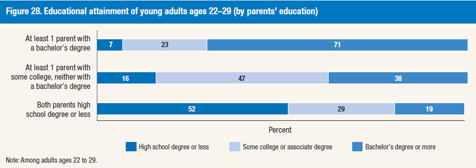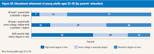What about the American Dream and the idea of America as the land of opportunity? If education is the great equalizer, then the future looks problematical. Survey results show that parental educational attainment affect their children’s education levels.