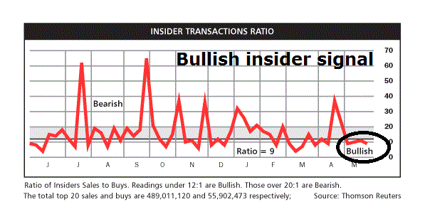 From an intermediate term technical perspective, the outlook is bullish. This chart from OpenInsider shows that insider selling usually exceeds insider buying and rarely do the two lines cross. In the last two instances where the two lines have intersected, downside equity risk was minimal.