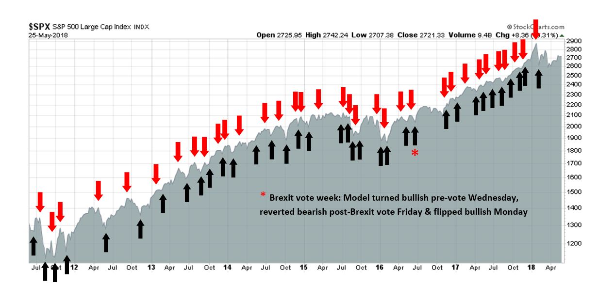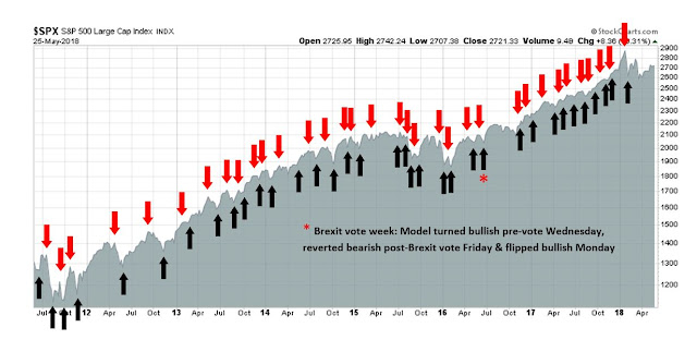 My inner trader uses the trading component of the Trend Model to look for changes in the direction of the main Trend Model signal. A bullish Trend Model signal that gets less bullish is a trading “sell” signal. Conversely, a bearish Trend Model signal that gets less bearish is a trading “buy” signal. The history of actual out-of-sample (not backtested) signals of the trading model are shown by the arrows in the chart below. The turnover rate of the trading model is high, and it has varied between 150% to 200% per month.