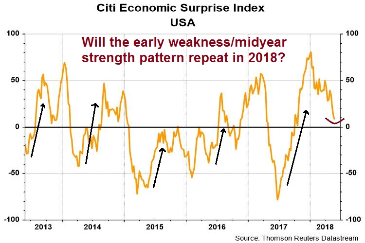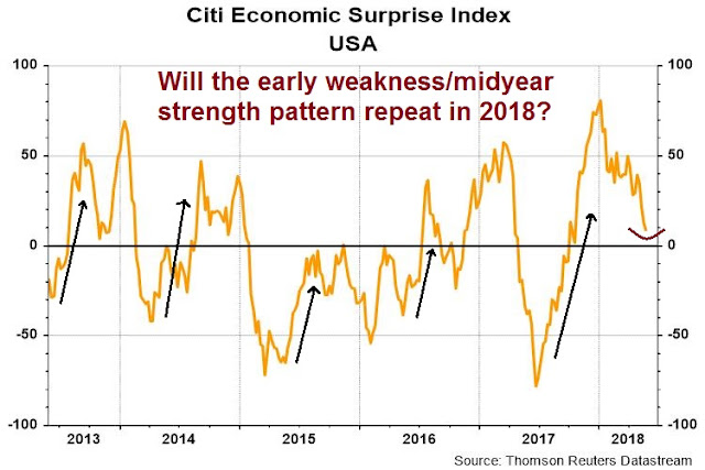 If I am correct, then the bond market won’t like the results. On the other hand, the stock market reaction will be a key test of investor psychology. Will good (economic) news be interpreted as good (stock market) news, or bad news? The Citigroup Economic Surprise Index has shown a pattern of weakness early in the year and then a strong recover midyear. Could the NFP kick off that strength?