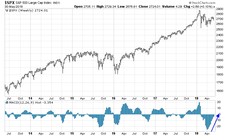 The weekly chart has a different message. MACD is rising, indicating that any market weakness is likely to be temporary and should be bought.