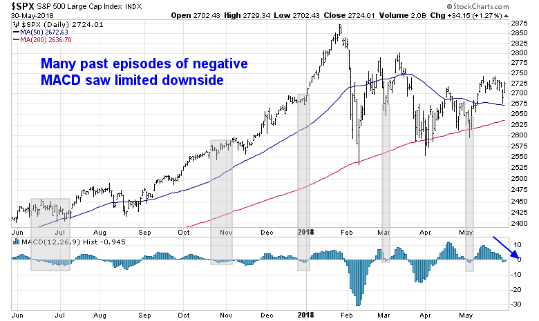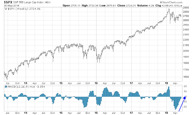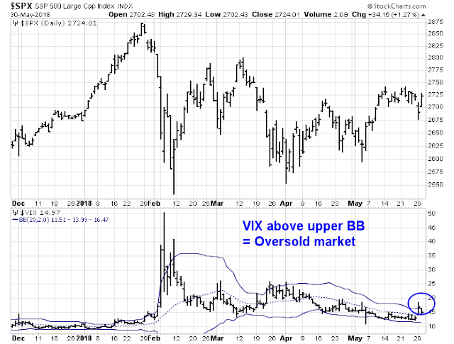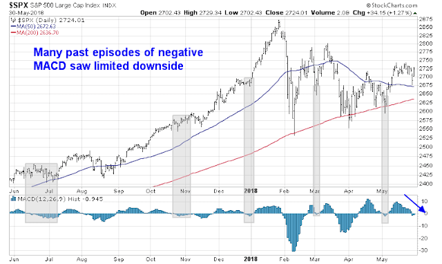 Indeed, daily MACD has been decelerating and turned negative this week, indicating that the bears are taking control of the tape. However, I would point out that many past episodes of negative MACD in the last year has seen little market downside, so an aggressive bearish trading stance may not be warranted.