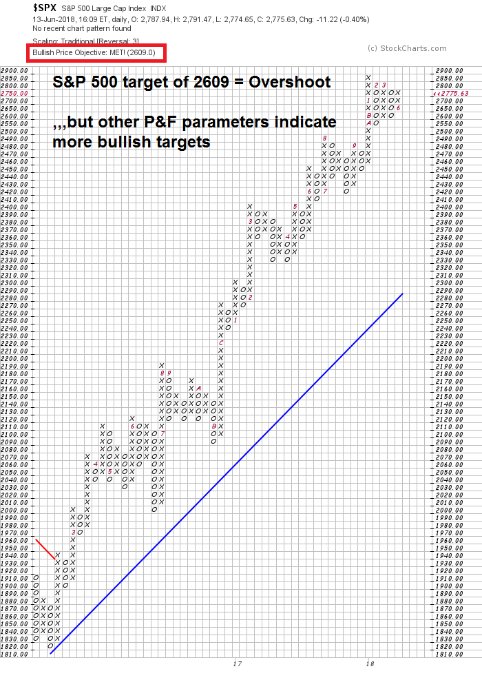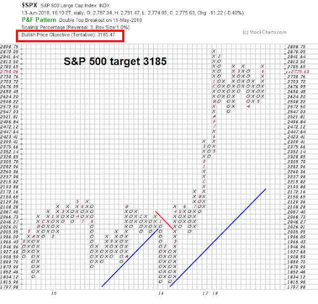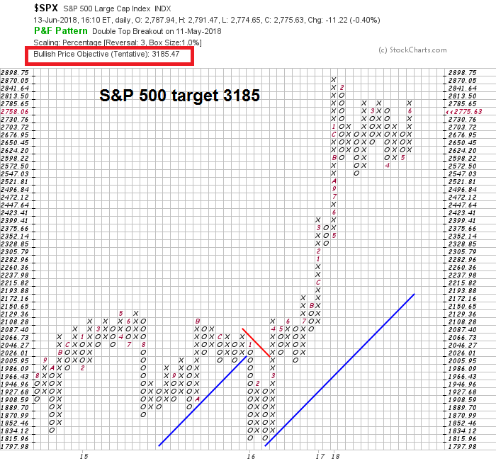 A point and figure chart using daily prices with a 1% box size and 3 box reversal yielded a target of 3185. The target was the same (3185) using weekly prices, and an astounding 4617 using monthly prices.