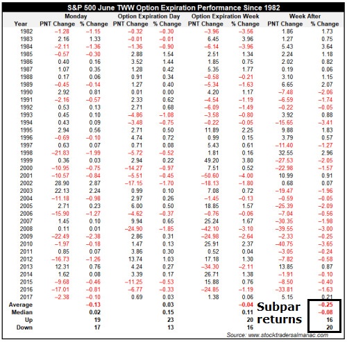 I would also point out that this week is OpEx week, and Jeff Hirsch at Alamanac Trader observed that the week after June OpEx has been challenging for equity bulls.