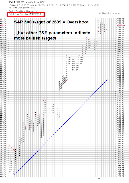 From a technical perspective, the answer was surprising. Applying point and figure chart on the SPX yielded a target of 2609 using the parameters of daily prices, and the traditional box size and 3 box reversal. Extending the time horizon to weekly prices, the target was 2549, and monthly prices, 2579.