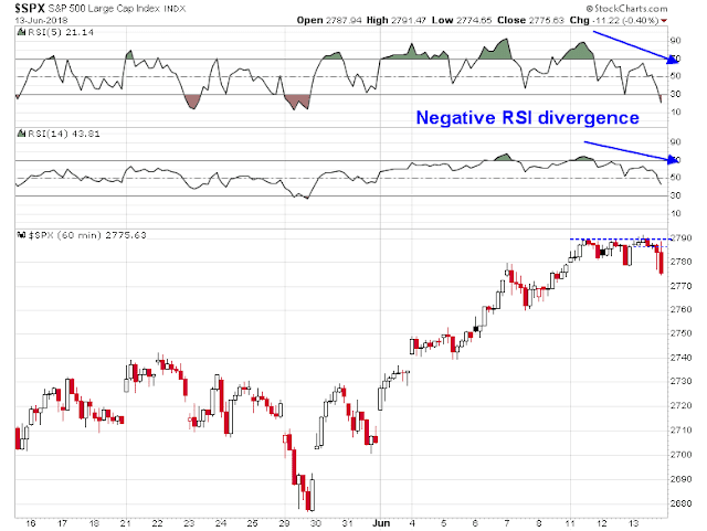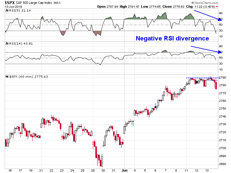 The hourly chart reveals the risks. The market is exhibiting a negative divergence even as it tested overhead resistance.