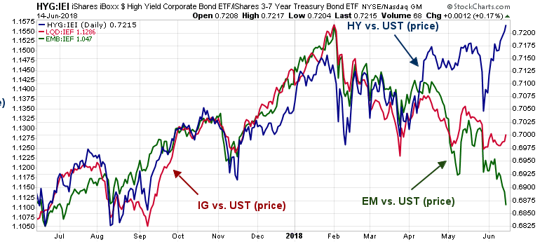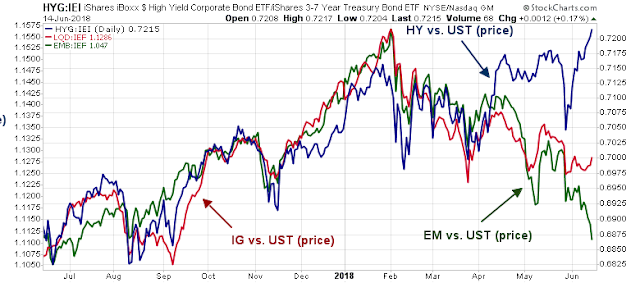 Still, not all is well. The rush into junk is creating an enormous gap between the relative price performance of junk bonds (blue line), investment grade bonds (red line), and emerging market bonds (green line) against equivalent duration Treasuries. Each sector is behaving according to its own dynamics. IG bond prices may be depressed by the effects of the latest tax bill, where companies that held offshore cash in IG paper have been selling their corporate bond holdings in order to repatriate cash into the US (see this analysis from Convex Capital Management). EM bonds are under stress because of rising rates that is pressuring fragile EM economies with external debt.