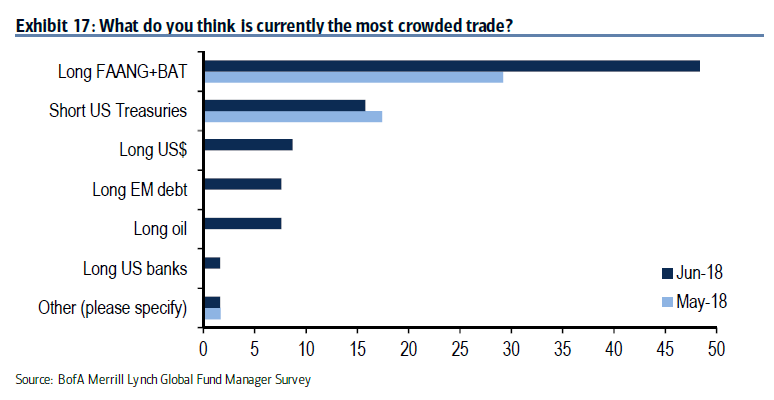 As they say, past performance is not an indication of future returns. That a mainstream publication like USA Today would try to project those kinds of returns based on meager summer job earnings may be a classic example of a contrarian magazine cover indicator sell signal. To be sure, the BAML Fund Manager Survey found that the most crowded trade is long FAANG + BAT (Baidu, Alibaba, and Tencent).