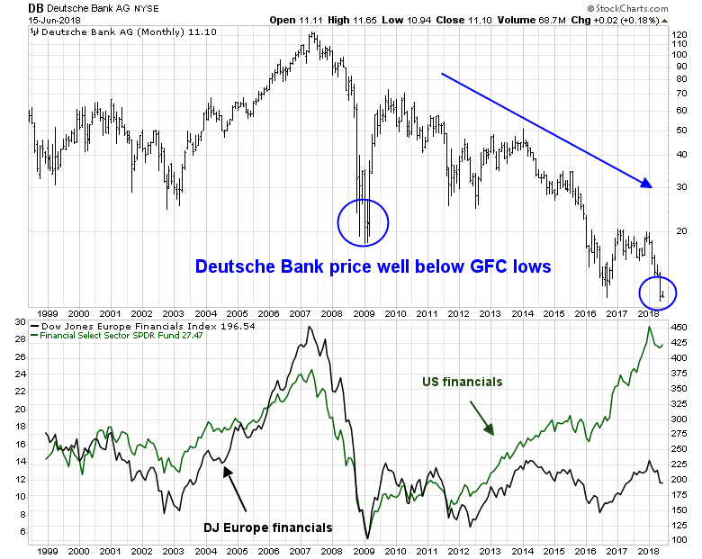 Europe, on the other hand, faces a different kind of fragility. In addition, to the well known problems of trade openness, the European banking system never solved the excess leverage problems from the last cycle. As a result, ever small wobbles in the EU economy will have an outsized effect on financial stability. The poster boy for Europe`s banking problems is Deutsche Bank, whose share prices is now trading at levels below the lows set during the Great Financial Crisis. Moreover, European financial stocks have dramatically underperformed US financials during the same period.