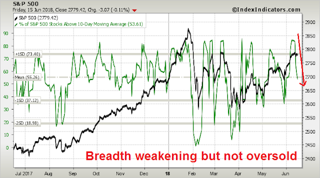 As well, medium term (3-5 day) breadth indicators from Index Indicators are showing negative momentum, but readings are neutral and not oversold. These conditions are suggestive of further downside potential over the next week.