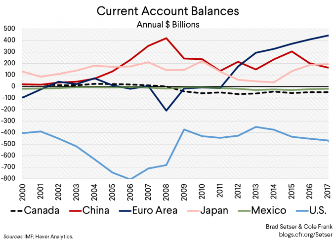 China’s annual manufacturing surplus is still around $900 billion (for comparison, Germany’s manufacturing surplus is around $350-400 billion depending on the exchange rate and the U.S. deficit in manufacturing is around $1 trillion) and doesn’t show any sign of falling. I don’t see signs that the (modest) real appreciation this year will seriously erode China’s competitiveness—though it should moderate China’s export outperformance (Chinese goods export volumes grew at a faster pace than global trade in 2017).
