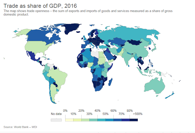 The accompanying chart from Our World in Data shows trade flows as a share of GDP. The American economy is less sensitive to trade flows than either China or Europe, though the trade sensitive of European countries is exaggerated in the chart as much of the trade represent flows within the EU. Nevertheless, exports make up about 20% of China`s GDP, and Germany is the locomotive of export growth in Europe. These circumstances make them especially vulnerable to trade sanctions.