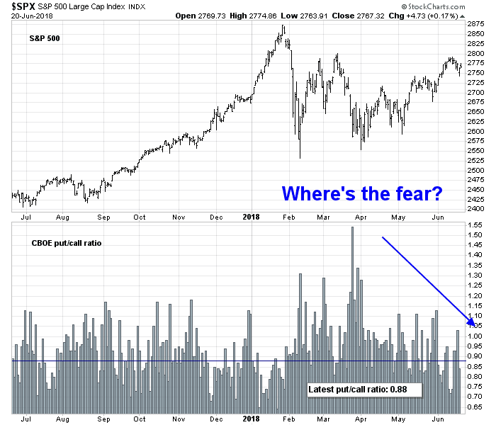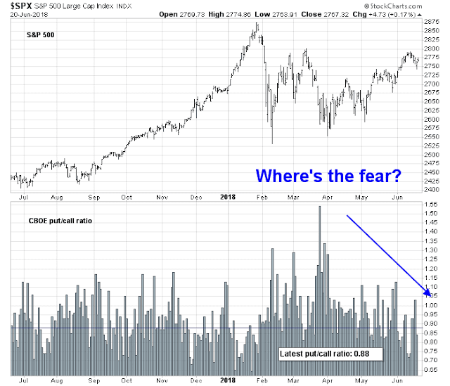 Other sentiment indicators are also showing signs of complacency. The latest CBOE put/call ratio stands at 0.88, which can hardly be interpreted as a high level of fear.