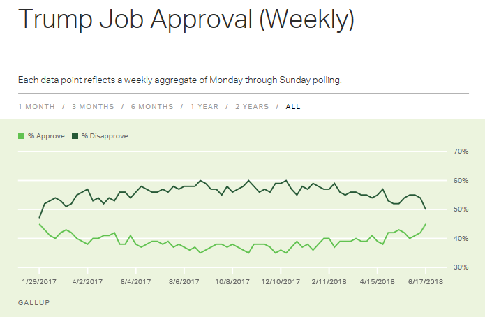Indeed, Gallup’s tracking poll of presidential approval has been steadily rising for much of this year. CNBC also reported that a majority of Americans approve of Trump’s handling of the economy for the first time.