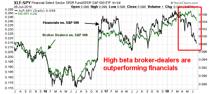 One other clue about market direction comes from the performances of Financial stocks. The sector has been lagging the market lately, but why are the high-beta broker-dealers beating the sector? Broker-dealer stocks have historically tracked the returns of the sector in general, and in a bear phase, you would expect them to show greater weakness. Instead, they are outperforming.