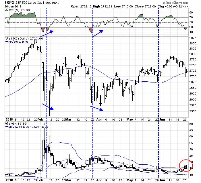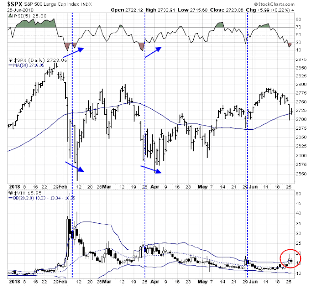 I tweeted the signs of a setup for a buy signal on Monday when the VIX Index rose above its upper Bollinger Band (BB). Past reversions of the VIX below its BB have been good trading buy signals. I would also point out that in two of the three past instances when these signals have occurred in the last six months, the market weakened after the buy signal to retest the previous lows before rallying. The retests were accompanied by positive divergence on RSI-5.