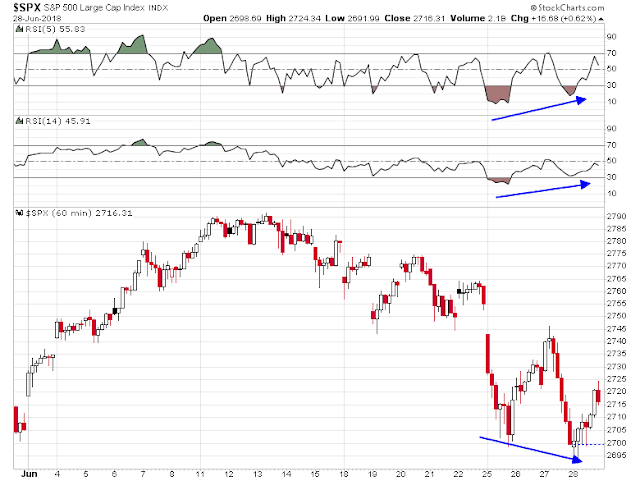 I wrote in my last post (see 4 reasons why the bull is still alive) that I was waiting for a re-test of the lows that was accompanied by a positive RSI divergence. We got the re-test yesterday (Wednesday) as the SPX undercut its previous low, but neither RSI-5 nor RSI-14 exhibited a positive divergence. Arguably, these readings could be interpreted as bearish because RSI-14 put in a lower low, indicating negative momentum, and RSI-5 remained oversold, indicating a “bad oversold” condition that implies further downside.