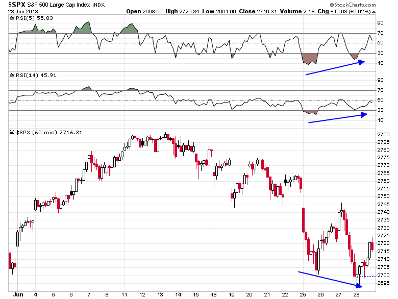 I wrote in my last post (see 4 reasons why the bull is still alive) that I was waiting for a re-test of the lows that was accompanied by a positive RSI divergence. We got the re-test yesterday (Wednesday) as the SPX undercut its previous low, but neither RSI-5 nor RSI-14 exhibited a positive divergence. Arguably, these readings could be interpreted as bearish because RSI-14 put in a lower low, indicating negative momentum, and RSI-5 remained oversold, indicating a “bad oversold” condition that implies further downside.