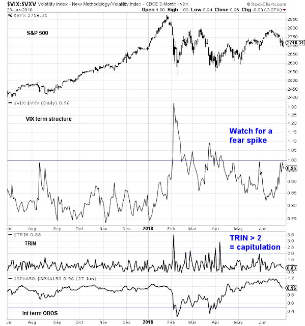 One worrisome feature of sentiment models is the market is not just showing enough panic for a durable bottom. None of the components in my Trifecta Bottom Spotting Model is flashing a buy signal. At a minimum, I would look for the VIX term structure to invert, indicating widespread fear, and TRIN to spike above 2, indicating a margin clerk/risk manager induced price insensitive capitulation. None of this has happened yet.
