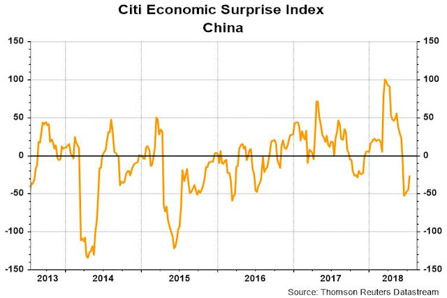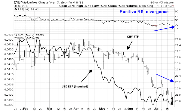 In addition, the market has shown a high degree of concern about weakness in the Chinese yuan (CNY), and it has viewa falling CNYUSD exchange rate as the trade war turning into a currency war. I agree with Ed Yardeni`s assessment that such an interpretation is erroneous. If the currency of country B fall against the currency of country A, but the currencies of countries C, D, and E also rise against the currency of country A, then country B is probably not manipulating its exchange rate. The problem lies with the policies of country A.
