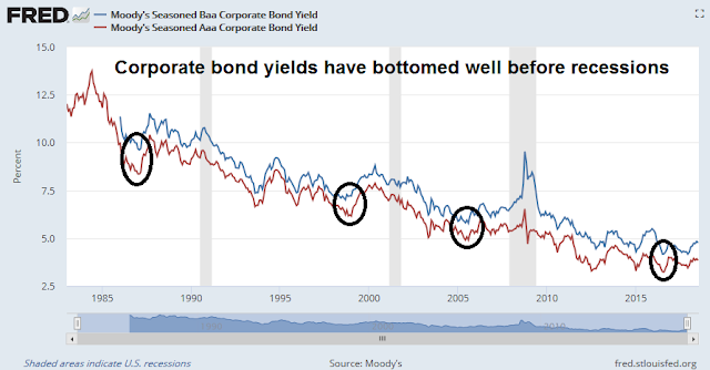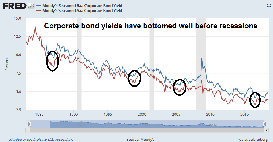 Among the corporate indicators, corporate bond yields have tended to bottom well ahead of past recessions. This indicator tends to be very early, therefore a bottom in yields should not be interpreted as a reason to panic, just a sign of a late cycle expansion.