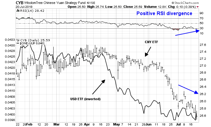 Over in Asia, China and Chinese related equities are bottoming after exhibiting positive RSI divergences. They appear to be poised for relief rallies.
