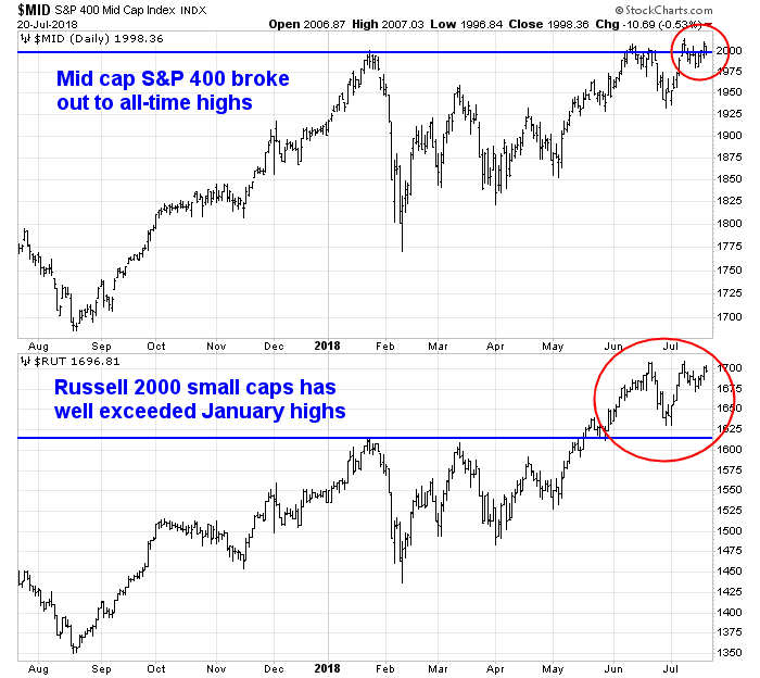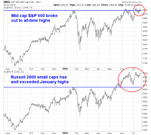 As well, I would also point out that mid and small cap stocks have broken out past their January highs, which addresses the complaints I have read that the market advance was accomplished with narrow participation.