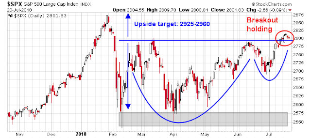 My inner investor remains constructive on equities. My inner trader would normally be piling in on the long side, but in view of his trip and possible uncertain internet connection, he is keeping his long commitment relatively light.