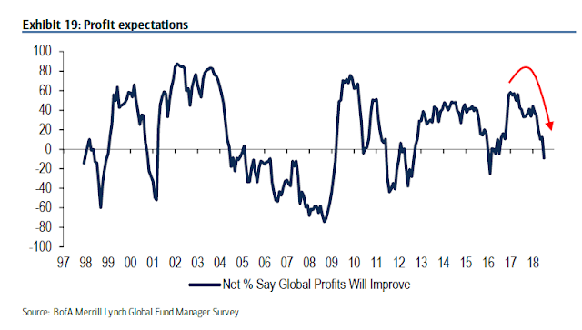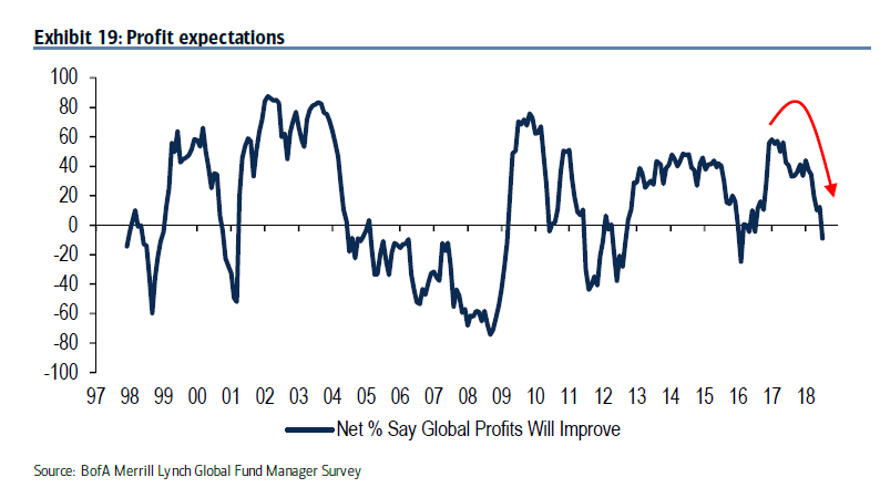 The latest BAML Fund Manager Survey shows that institutional managers have turned decidedly cautious on the outlook for the global economy. Profit expectations are tanking, positioning has turned more defensive, as global equity weights are being trimmed, and bond weights are rising, though managers remain underweight the asset class.