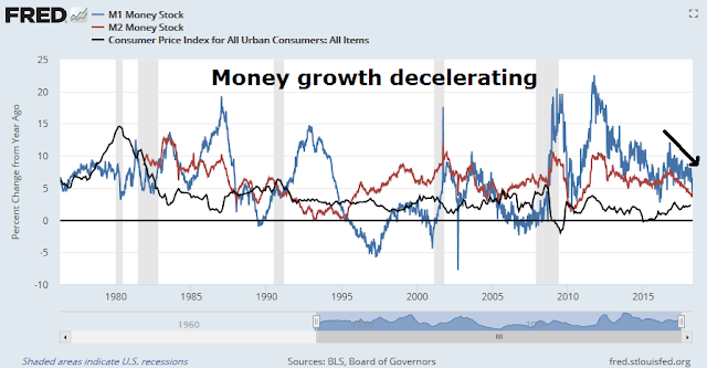Even if we were to discount the predictive power of the yield curve because of the Fed`s QE program that affected the long end of the curve, real money supply growth, measured as either M1 or M2, has turned negative ahead of past recessions. The Fed`s policy of normalizing monetary policy has seen money supply growth decelerate. While the data is very noisy, both real M1 and real M2 growth are decelerating rapidly and are on the verge of turning negative.