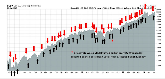 My inner trader uses the trading component of the Trend Model to look for changes in the direction of the main Trend Model signal. A bullish Trend Model signal that gets less bullish is a trading “sell” signal. Conversely, a bearish Trend Model signal that gets less bearish is a trading “buy” signal. The history of actual out-of-sample (not backtested) signals of the trading model are shown by the arrows in the chart below. The turnover rate of the trading model is high, and it has varied between 150% to 200% per month.