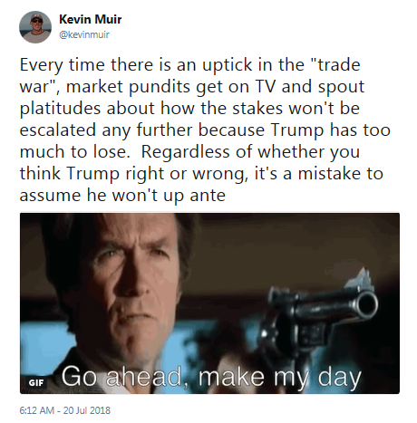 On the other hand, if you take Kevin Muir’s position and Trump will increasingly press his trade policy views as we approach the mid-term elections, then you should either sell everything or possibly short the market.