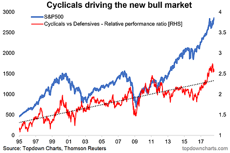 Another clue from sector leadership can be seen in the performance of cyclical stocks compared to defensive stocks. Callum Thomas of Topdown Charts observed that cyclical stocks have been one of the key drivers of this equity bull, but the cyclical to defensive stock ratio is starting to roll over.