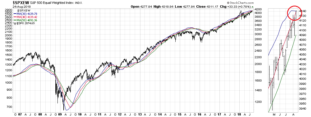As well, consider how the 30, 40, and 50 WMA trend following model is telling us about market conditions when we apply the model to the Value Line Geometric Average, which is another broad measure of the stock market.