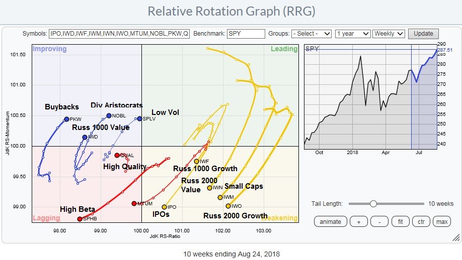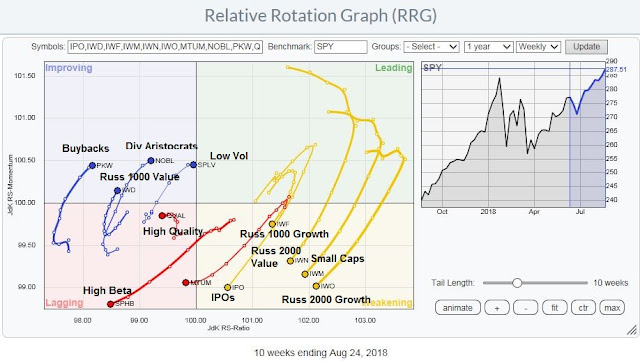 The latest RRG of style, or factor, leadership shows that the leading groups have become defensive and value in nature, while high-octane groups, such as IPOs, high beta, and price momentum are either weakening or lagging. This shows how the character of stock market internals have shifted in the past 10 weeks from growth to value, and from high beta to defensive factors.