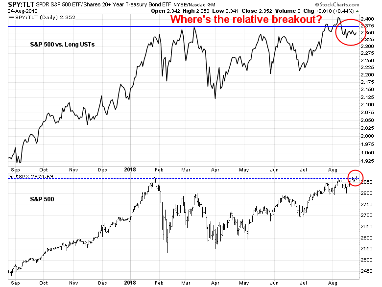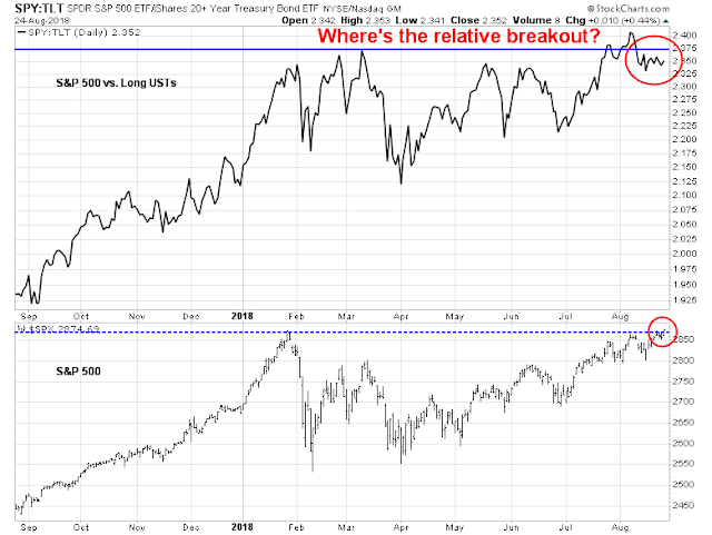 In the US, evidence of technical deteriorating is starting to appear. Consider the stock/bond ratio (SPY/TLT), which includes the total return. As the S&P 500 broke out to an all-time high last week, why did SPY/TLT behave so poorly? This ratio staged an upside relative breakout to fresh highs in early August, pulled back to test the breakout level, and it has been unable to strengthen back above relative resistance. Is that telling us something about risk appetite?